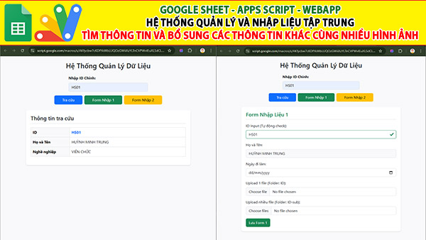 Dự án là một ứng dụng Web App tùy chỉnh (Custom Web App) được xây dựng trên nền tảng Google Apps Script, cung cấp giải pháp khép kín cho quy trình: Tra cứu – Xác thực – Nhập liệu – Lưu trữ. Hệ thống biến Google Sheets thành cơ sở dữ liệu mạnh mẽ và Google Drive thành kho lưu trữ thông minh, loại bỏ hoàn toàn các thao tác thủ công rườm rà.